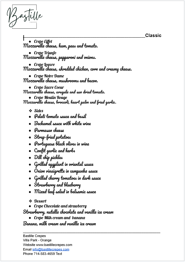 Bastille Crepes offers a unique gourmet experience, bringing authentic French flavor to a variety of events. Thin and versatile, crepes are icons of French cuisine, enjoyed in both sweet and savory versions. Our catering provides sophistication and interactivity, with live preparation that delights guests. Originating in Brittany in the 13th century, made with buckwheat, crepes symbolize versatility, adapting to modern ingredients. We offer customized fillings, such as Nutella, fruits, cheeses, proteins and vegetables, catering to all tastes. The skill of the crepe maker on the griddle is a spectacle in itself. In France, crepes are a social tradition, consumed at fairs and cafes. Our service brings this cozy atmosphere, connecting people through flavors. Ideal for weddings, corporate events or casual gatherings, we guarantee a memorable experience. The culture of crepes reflects the elegant simplicity of France, combining history and conviviality.